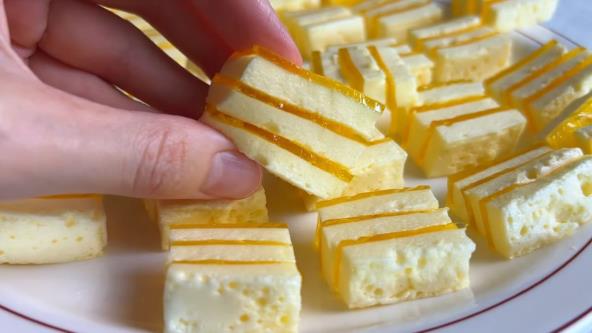 Prvu kesicu želea pripremite tako što je samo prelijete vodom prema uputstvu (bez mućenja). Drugu kesicu pripremite prema uputstvu, ali umesto samo preliva vodom, umutite je mikserom dok ne postane penasta i gusta. Sipajte prvu smesu u drugu i promešajte špatulom. Izlijte lagano u posudu obloženu providnom folijom i ostavite da se stegne u frižideru. Kada se žele dobro stegne, izvadite ga iz pleha, pažljivo uklonite foliju i isecite na trake. Videćete da je žele koji nije bio umućen pao na dno. Spajajte trake tako da budu po tri - žuti sloj sa belim između, formirajući zanimljive kombinacije.