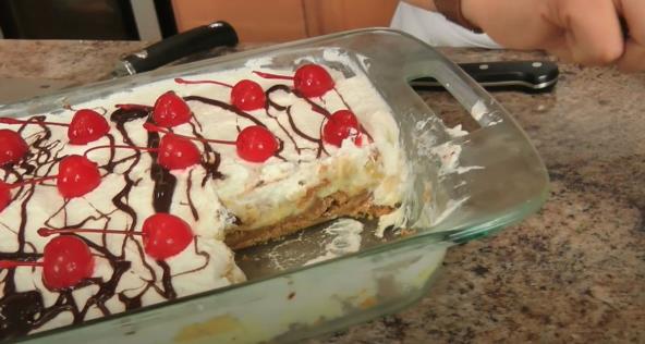 Preko krema stavite sloj isečenih banana, zatim zgnječeni ananas, a zatim šlag. Pokapajte čokoladnim topingom po vašem izboru, zatim ukrasite višnjama, lagano prekrijte plastičnom folijom i stavite u frižider na najmanje 6 sati ili preko noći. Uživajte! Možda ćete želeti da napravite i lagani kolač od limuna i maskarponea.