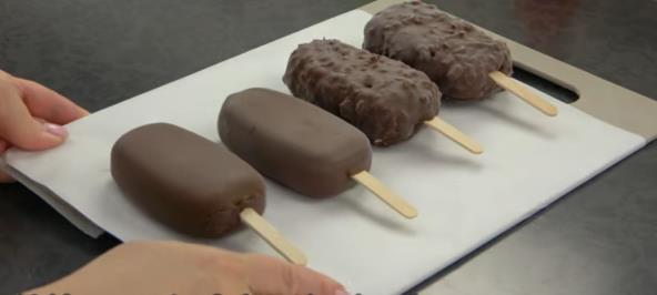 Otopite crnu čokoladu na pari, dodajte kokosovo ulje i promešajte da se sjedini. Sipajte čokoladu u visoku čašu pogodnu za umakanje. Izvadite sladolede iz kalupa i brzo ih umočite u čokoladu – ona će se odmah stegnuti. Po želji, u ostatak čokolade dodajte seckani kikiriki i umočite još jednom za dodatnu hrskavost. Vratite sladoled u zamrzivač na još 10 minuta pre posluživanja.