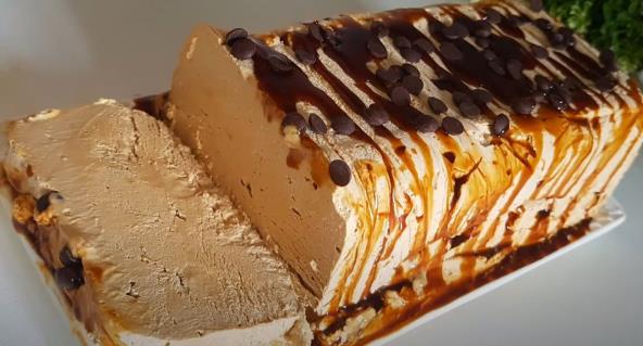 Ubacite ga u zamrzivač na najmanje 3 sata. Izvadite potom iz zamrzivača, pospite čokoladnim komadićima i prelijte čokoladnim topingom, pa isecite i uživajte! Možda ćete želeti da napravite i domaći sladoled od kafe koji svi vole.