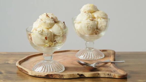 Rasporedite sladoled u čaše ili činije za serviranje. Po želji pospite seckanim lešnicima i prelijte medom. Poslužite odmah.