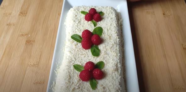 Sve promešajte pa dodajte grčki jogurt. Mešajte žičanom mutilicom. Zatim obložite kalup za kolače papirom za pečenje. Sipajte smesu u kalup, prekrijte najlonskom folijom pa ostavite u frižideru preko noći. Narednog dana prebacite na tanjir za serviranje, pospite rendanom belom čokoladom i ukrasite malinama. Uživajte! Možda ćete želeti da napravite i sočni kolač sa jogurtom i kajsijama.