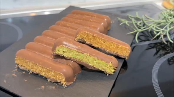 Polovinu otopljene čokolade ravnomerno rasporedite po dnu silikonskog kalupa. Na čokoladu stavite kadaif smese – polovinu sa kremom od pistaća na jednu stranu, polovinu sa lešnik kremom na drugu stranu. Prelijte sve ostatkom čokolade tako da se slojevi lepo povežu. Ostavite u frižideru da se čokolada potpuno stegne. Nakon što se stegne, izvadite iz kalupa i secite na štanglice.