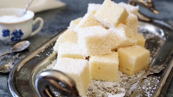 Kada se masa stvrdne, izvadite je iz kalupa i isecite na kocke željene veličine. Poslužite dobro rashlađeno.