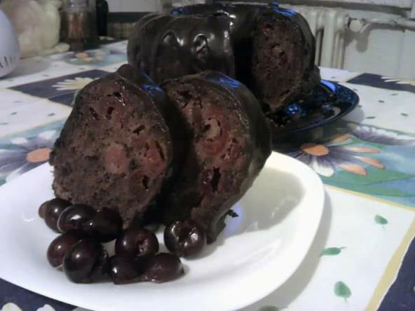 Prosejati brašno i prašak za pecivo. Izlupati jaja i odvojiti žumanca od belanaca. Od belanaca umutiti čvrst sneg. Zatim u posebnu činiju mikserom izmutiti žumanca, šećer i razmekšali maslac. Lagano u penu od belanaca usuti umućena žumanca i ostale sastojke, kakao, koru limuna i brašno. Dobro izmešati, usuti u kalup.ubaciti trešnje i peći. Posebno otopiti crnu čokoladu i preliti kuglof.
