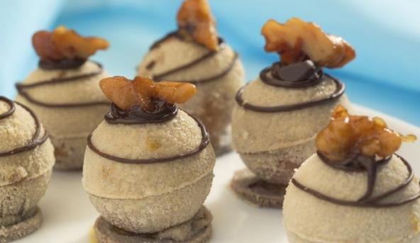 3. Na pari rastopiti maslac sa belom i mlečnom čokoladom. Svaku kuglicu nabosti na čačkalicu, umočiti u glazuru i odozgo ukrasiti jezgrom lešnika.