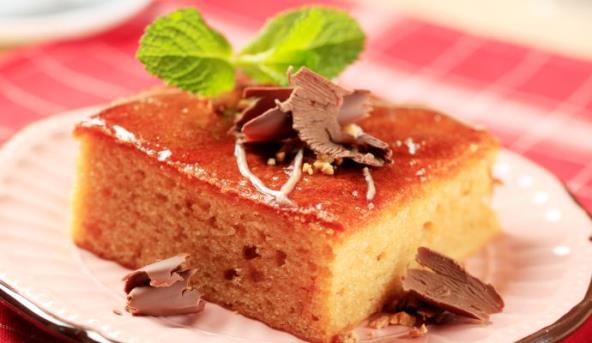 4. Ispečen kolač još vruć lagano zaliti toplim sirupom i ostaviti da se ohladi. Potom ga čuvati na hladnom mestu, i služiti isečenog na kocke.