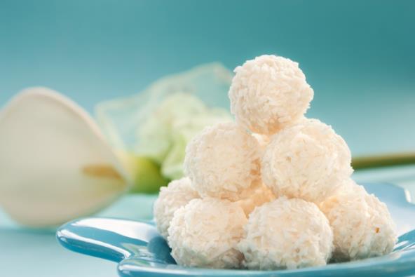 4. U svaku bombicu stavite po jedan badem ili lešnik i tako napravljene bombice uvaljajte u kokosovo brašno.