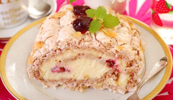 U veću tepsiju stavite mastan papir, pospite šećerom u prahu i poslažite listiće badema. Rernu zagrejte na 200 stepeni i stavite malo bademe da se preprže. Umutite belanca sa šećerom i istresite na ohlađene bademe. Pecite 10 minuta, zatim smanjite vatru na 160 stepeni i pecite još desetak minuta dok belanca ne požute. Izvadite i ohladite. U međuvremenu umutite pavlaku s prah-šećerom po ukusu u čvrst šlag i prekrijte ohlađeni kolač. Odozgo stavite voće po želji. Obavezno kolač držite u frižideru. Pomoću masnog papira koji je podloga, izvucite kolač iz pleha i urolajte ga. Po želji, možete ga preliti i glazurom od čokolade.