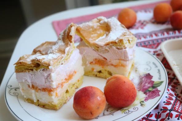 Staviti u šerpu vodu, 100g margarina pa kad provri dodati brašno (bude gusto) i malo mešati da nema grudvica. Prohladiti, pa dodavati jedno po jedno jaje i mutiti mikserom da se izjednači. Ispeći od toga dve kore na 200° oko 40- 50 min. Stavite mleko da provri i onda dodate 100-150g šećera i vanilin šećer. Gustin rastvorite sa hladnom vodom ili mlekom, pa ga prebacite u provrelo mleko i zakuvate. Mešajte žicom da se ne zgrudva. Ohladiti dobro, pa izmešati sa izmućenim margarinom u koji ste dodali 2 kašike prah šećera. Prvu koru okrenuti naopako, pa je premazati sa kremom od gustina. Kajsije popariti, oljuštiti, pa kad se prohladi poređati na kremu od gustina.