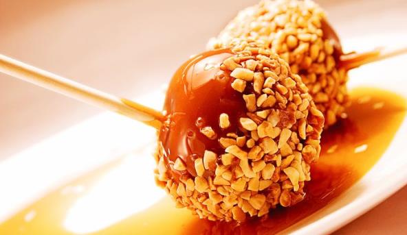 3. Odstranite peteljke iz jabuka i zabodite štapić. Umočite svaku jabuku u karamel i okrenite da se sos nanese ravnomerno. Pospite seckanim lešnikom, a zatim poslasticu prebacite na papir za pečenje.