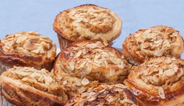 2. Rernu zagrejati na 180 stepeni. Pomešati krem sir, koru od limuna i šećer. Dobijenom masom premazati testo, pa posuti bademima i suvim grožđem po želji. Testo urolovati, pa ga podeliti na 9 komada i poređati ih u okrugao pleh (prečnika 26 cm). Premazati žumancetom i peći 50 minuta. Ružice posuti seckanim bademima i servirati.