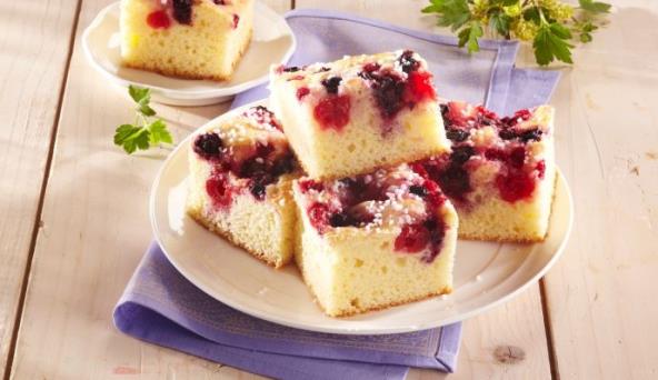 2. Maslac umutiti sa šećerom i vanilin šećerom. Dodati jaja i onda jogurt. Pomešati brašno, gustin, prašak za pecivo, pa dodati u masu i izmešati. Ocediti voće od viška vode. Polovinu testa razliti po nauljenom četvrtastom dubokom plehu posutom brašnom. Odozgo rasporediti polovinu bobica, pa ostatak testa. Posuti ostatkom bobica. Peci oko 70 minuta. Izvaditi i ostaviti 20 minuta u kalupu da se hladi. Izručiti kolač iz kalupa i pustiti ga da se potpuno ohladi.