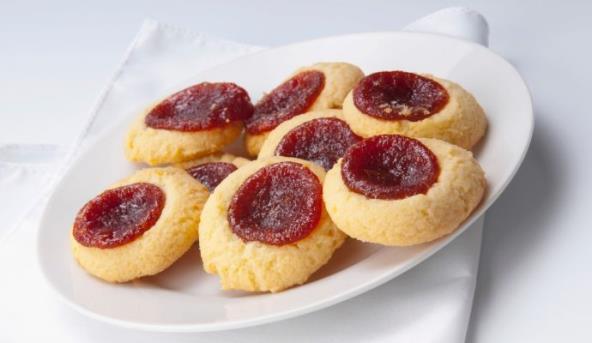2. Nanesite malo brašna naruke pa testo oblikujte u valjak prečnika oko 5 cm. Nožem isecite kolačiće širine 2 cm. Napravite na kolačićima malo udubljenje na sredini i tu stavite po kašičicu džema.