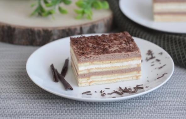 U kalup dimenzija 23×25 cm slažite keks koji ste umočili u mleko. Preko rasporedite pola svetlog fila, zatim opet red keksa, pa pola crnog fila, red keksa, pa preostali beli fil, keks i na kraju preostali crni fil. Izrendajte čokoladu preko. Svaki put keks treba da umočite u mleko.