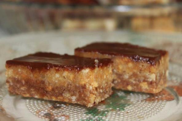Pouljite malo tacnu ili pleh, istresite tamniji deo. Rastanjite,pa preko njega stavite svetli deo. Rukama rastanjite i taj deo blago pritiskajući. Prelijte sa glazurom od čokolade. Ostavite da se stegne u frižideru pa secite.