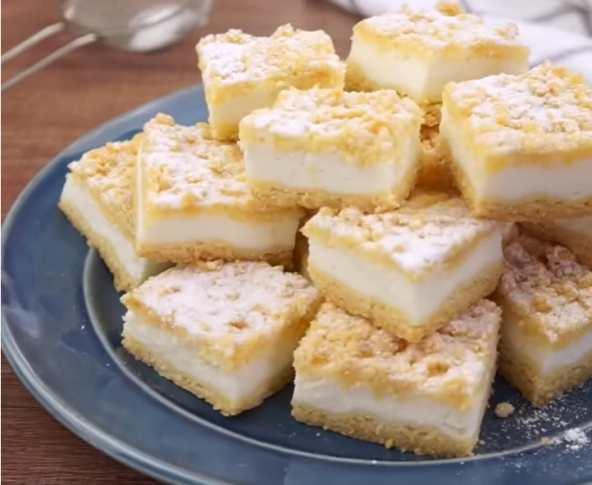 Kalup obložite sa pek papirom, pa stavite jednu loptu testa. Prstima lepo utisnite i na par mesta izbodite viljuškom. Sipajte smesu sa jogurtom, a drugu loptu testa izrendajte preko. Pecite u zagrejanoj rerni na 180°C nekih 35 minuta. Pospite šećerom u prahu i isecite.