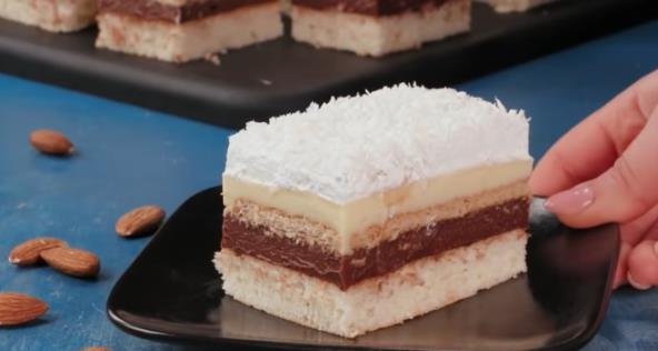 Preko biskvita sipajte prvo čokoladni deo, pa red keksa koji ste umočili u mleko, pa žuti deo. Ostavite da se ohladi 2 sata. Premažite umućenom slatkom pavlakom i pospite kokosom.