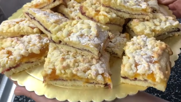 Puter, jaja, šećer i koru limun sjedinite, pa dodajte brašno i prašak za pecivo. Umesite glatko testo, obmotajte providnom folijom i stavite u frižider na pola sata. Podelite testo na 3 dela. Razvucite testo u obliku pravouganika, pa ga prebacite na pleh obložen pek papirom uz pomoć oklagije. Premažite džemom od jagoda ili šljiva, pa stavite preko razvučeno drugo testo. Premažite džemom od kajsije i na kraju preko narendajte treće testo. Pecite na 200°C nekih 20 minuta. Pospite šećerom u prahu i isecite na kocke.