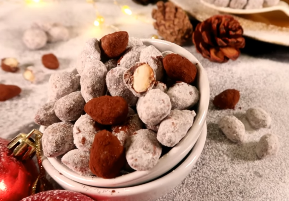 Bademe stavite na pleh obložen pek papirom. Sipajte preko šećer u prahu i rukama promešajte. Pecite na 160°C oko 10 minuta. Istopite čokoladu, pa dodajte vanilu i božićne začine. Promešajte. Sipajte preko badema i dobro sjedinite. Zatim uzmite neku posudu sipajte unutra šećer u prahu, pa bademe sa čokoladom i protresite. Ostavite da stoje 30 minuta pre nego što ih jedete. Možete da ih uvaljate i u kakao.
