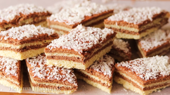 Za ovaj kolač je potrebno obično i čokoladno testo. Kada se ispeče premaže se džemom i pospe kokosom. To je sva nauka. Brzo se i lako prave, a ukus je neverovatan. Možete da poslužite kada su slave ili praznici. Garantujemo da će svi uzeti da probaju.