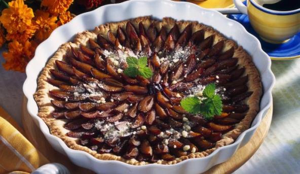 2. Rernu zagrejte na 200 stepeni. Uljem podmažite pleh s visokom ivicom. Ravnomerno razvucite testo i njime obložite pleh. Šljive operite, očistite od koštica i isecite na četvrtine. Gusto ih poređajte po testu s kožicom okrenutom nadole (ređajte ih kao crepove na krovu). Pomešajte šećer i cimet, pa s bademima pospite preko šljiva. Umutite žumance sa slatkom pavlakom i time premažite ivicu testa.
