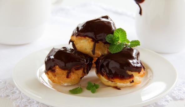 5. Za preliv: Slatku pavlaku zagrejte, umešajte izlomljenu čokoladu, izmešajte u jednoličnu smesu i ohladite. Ovim prelivom prelijte profiterole.