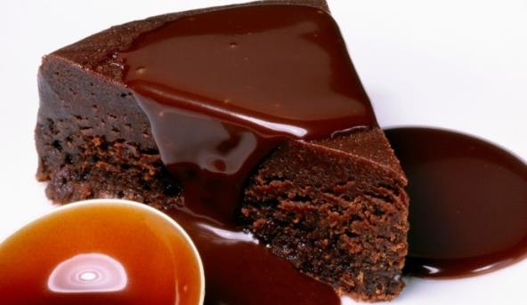 4. Istopite čokoladu i maslac, uz mešanje dok ne postane skroz glatko. Toplu glazuru sipajte preko ohlađenog kolača, a nožem izravnajte ivice. Nakon toga, stavite kolač u frižider 20 – 40 minuta, dok se ohladi. Pre služenja ostaviti kolač oko 30 minuta na sobnoj temperature da se prohladi.