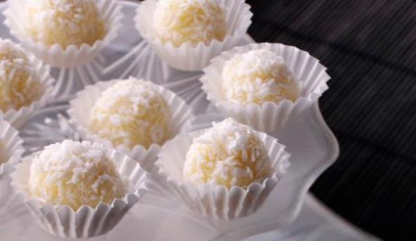 3. Vadite po malo kašičicom i pravite kuglice s oljuštenim bademom u sredini (badem se lakše ljušti ako se prethodno popari u vreloj vodi - blanšira) i uvaljajte u kokosovo brašno.