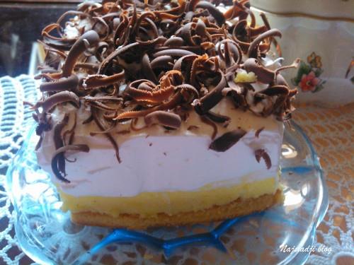 Sipati u šerpu litar vode, ostaviti dve šoljice za piding pa kad voda provri sipati izmešan puding. U Receptu ne piše da se puding sladi ja sam dodala 3 kašike šećera. Za to vreme nam se ispekla korica i izvadimo je na dasku i ne vadimo iz pleha. Izmešamo šne i puding, stim što u šne dodajemo puding po dve tri kašike i mešamo varjačom dok se sve ne sastavi. Dobićemo divnu kremastu masu koju brzo istresamo na pečenu koricu i oblikujemo nožem. Napominjem mora se brzo raditi jer se krema steže. Kad se krema malo prohladi dodati odozgo 300 gr umućenog šlaga i ukrasiti rendanom čokoladom. Naša krempita je gotova i izgleda prelepo. Ukus je sjajan. Prijatno !
