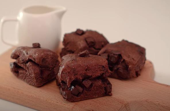 Pomešajte brašno, kakao, šećer, prašak za pecivo i malo soli, pa sjedinite dobro mešanjem. Dodajte celo jaje i vodu, pa mesite da dobijete glatko testo svega par minuta. Ubacite čokoladne mrvice. Smesu oblikujte u kvadrat pa presecite na četiri jednaka dela, ili šest ukoliko želite sitnije kocke. Poređajte u pleh obložem pek papirom i pecite na 170 C nekih 20 minuta.