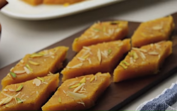 Istopite puter, pa dodajte brašno i mešajte dok ne postane glatko. Zatim u isti tiganj sipajte mleko (1/2), opet promešajte, pa šećer. Sjedinite i sipajte mleko (1/2 šolje). Sve dobro promešajte, pa dodajte kardamom i seckane bademe i pistaće. Stavite na tacnu koju ste premazali puterom ili uljem, pa napravite oblik pravouganika. Pospite presotalim bademima i pistaćima. Poslužite.