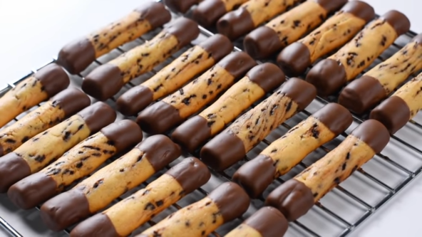 Jaja, šećer, ulje, vanilu i prstohvat soli dobro umutite. Dodajte brašno i prašak za pecivo, pa dobro sjedinite. Na kraju dodajte i čokoladne mrvice i dobro promešajte. Testo treba da bude mekano, a ne lepljivo. Napravite oblik valjka, pa podelite na 8 delova. Svaki istanjite da dobijete zmijicu. Isecite na 6 delova i poređajte na pleh obložen pek papirom. Pecite na 160-170°C oko 25-35 minuta. Umočite oba kraja u istopljenu čokoladu.