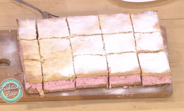 Sve umutite mikserom da se lepo sjednini. Lisnato testo razvucite oklagijom što tanje, podelite na dva dela i pecite na 180 C nekih 15-ak minuta. Jednu koru stavite na poslužavnik, pa je premažite celim filom, ravnomerno ga rasporedite i odozgo stavite drugu koru. Stavite je u frižider na 2 sata da se stegne. Po želji je pre služenja pospite šećerom u prahu.