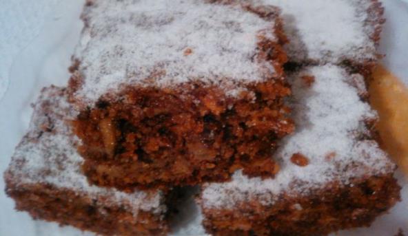 1. Umutiti jaja sa šećerom, dodati ulje i mleko, jabuke, griz sa praškom za pecivo, orahe i kakao prah. Masu sipati u podmazanu i pobrašnjenu tepsiju i kolač peći na 200 stepeni oko 30 minuta.