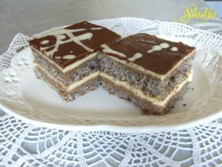 Od navedenog materijala ispeći dve kore. Skuvati fil: Od mleka odvojiti 5 kašika mleka pa izmešati sa žumancima, pudingom i šećerom, pa u mlazu sipati u ostalo mleko koje smo stavili da se kuva. Kada se fil zgusne skloniti ga sa vatre i ohladiti. Zatim u ohlađeni fil dodati umućen margarin ili puter. Kada smo sve lepo sjedinili dodamo kesicu neumućenog šlaga i još malo mutimo. Trećinu fila odvojimo, pa dodamo 2 kašičice kakaoa. Filujemo: Kora (poprskana nekim sokom)-tamni fil-svetli fil, pa opet kora-tamni fil svetli fil, odozgo istopljena čokolada. Seći ili kocke ili u štanglice....