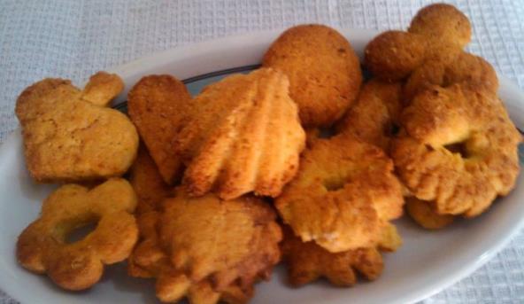 1. Umutiti mikserom margarin, mast, šećer, pecivo, i jaja da budu penasto. Dodati brašno, koru pomorandže i vanilu.