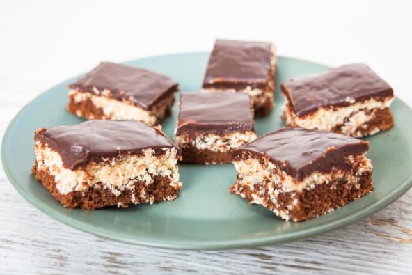 Stavite litar mleka da provri, apotom dodjate griz i sve promešajte. Dodajte vanilin šećera i šećer, pa kuvajte na slaboj vatri dva, do tri minuta, a potom dodjate kokosovo brašno. Sve dobro izmešajte i ostavite da se fil ohladi. Za to vrijeme napravite biskvit. U jaja dodajte šećer, pa dobro umutite mikserom da pobele, a potom dodajte i ostale sastojke. Prvo ulje, potom mleko, brašno i prašak za pecivo. Na samom kraju dodajte kakao. Dobro umutite tako da ne bude grudvica, a zatim izlijte u pleh za pečenje obložen pek papirom. Pecite na 180 stepeni oko 15-20 minuta. Kada je pečena ostavite da se malo prohladi, a zatim preko kore ravnomerno rasporedite fil. Čokoladu istopite na pari, pa lagano prelijte preko kolača i sve lepo poravnajte špatulom. Ostavite u frižideru na neka 2-3 sata da se stegne. Secite na kocke željene veličine i služite.
