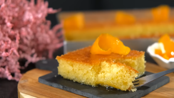 U šerpu sipajte vodu, šećer, koru pomorandže i limunov sok. Kuvajte dok ne proključa, a onda ostavite još 7 minuta na šporetu, pa sklonite. Krem sir umutite sa jajima i šećerom u prahu. Dodajte maslinovo ulje, prosejano brašno sa praškom za pecivo, griz, vanilu i so. Mešajte dok ne dobijete gustu smesu bez grudvica. Zatim sipajte u nauljenu tepsiju i poravnajte. Pecite u zagrejanoj rerni na 180°C oko 35 minuta. Ohlađeni sirup sipajte preko vrelog kolača. Isecite i ukrasite korom od pomorandže.