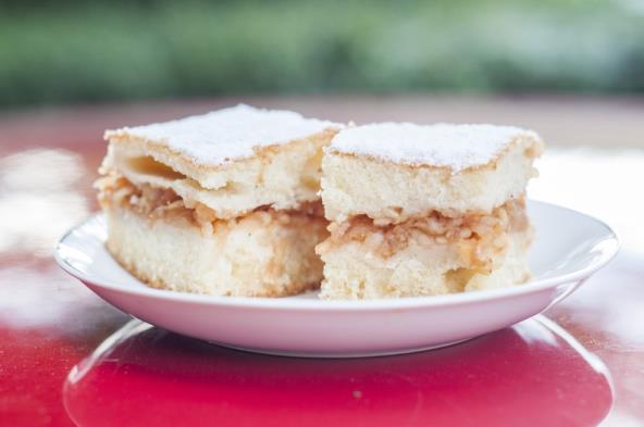 U mast dodajte šećer i dobro umutete. Zatim dodajte žumanca i belance i mutite dok se sve ne sjedini. Postepeno dodajte prosejano brašno sa praškom za pecivo (pola količine), a onda i mleko. Dobro umesiti i dodajte ostatak brašna. Testo ne sme da se lepi, pa ako je potrebno dodajte još brašna. Jabuke oljuštite i narendajte, pa prodinstajte. Kada omekšaju i malo puste vodu dodajte griz, orahe, cimet, vanilu i prašak za pecivo. Sve dobro sjedinite i ostavite da se ohladi. Testo podelite na 2 dela, pa razvucite oklagijom i stavite u pleh. Lepo pritisnite rukom da sve bude jednako, pa sipajte fil od jabuka i lepo rasporedite. Preko stavite u drugu razvučenu koru, a ako se malo raspadne samo rukama lepo složite da pokrijete ceo fil. Pecite na 180°C oko 45 minuta. Ako želite pospite šećerom u prahu.