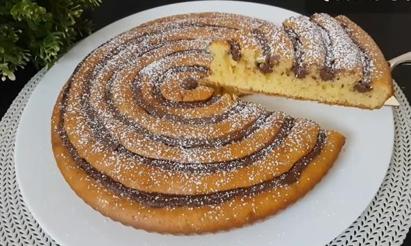 Jaja pomešajte sa šećerom i vanilin šećerom, dodajte prstohvat soli, a zatim sve umutite ručnom mutilicom. Sipajte ulje, malo promešajte, zatim dodajte mleko. Brašno pomešajte sa praškom za pecivo, pa postepeno dodajte u smesu i mešajte. Treba da dobijete nešto ređe testo. Okrugli kalup za pečenje pospite brašnom, pa u njega prelijte testo. Nutelu sipajte u špric, pa pravite kružne šare po testu. Pecite u rerni zagrejanoj na 170 stepeni oko 30 minuta.