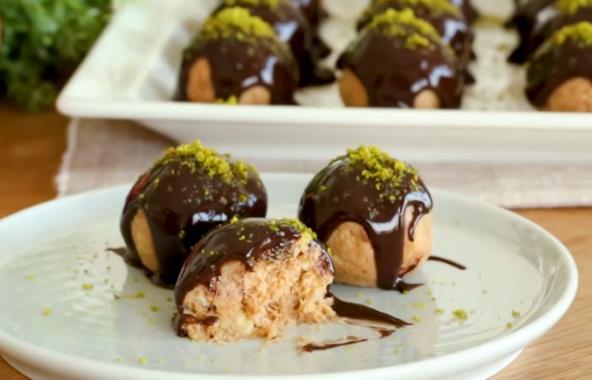 Za početak ogulite 2 velike jabuke, isecite ih na četvrtine i izvadite jezgro. Izrendajte ih na sitnije rende. Rendane jabuke ostavite sa strane. U njih dodajte keks, zatim kašičicu cimeta i pola šolje zdrobljenih oraha. Mešajte smesu dok se ne poveže. Formirajte kuglice. Pokrijte prozirnom folijom da se ne osuše. Ostavite ih u frižideru 30 minuta.