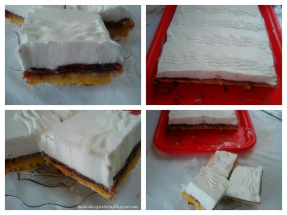 Fil: Ušpinovati 13 kašika šećera sa pola čaše vode pa ubaciti jagode da malo kuvaju i u to dodati dva pudinga od vanile ili jagoda. Kad se malo prohladi krem od jagoda sipati ga na pečeni patišpanj.Kolač ohladiti i odozgo umutiti šlag...i naravno sladite se dragi moji. Recept možete pogledati i u VIDEO izdanju