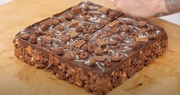 U velikoj činiji pomešajte obe vrste čokoladnih pahuljica, čokoladne kuglice i mini mančmelou. Na kraju dodajte komadiće čokolade i iseckane čokoladice sa karamelom koje ćete pre toga ostaviti u zamrzivaču na nekoliko minuta kako se ne bi istopili. Sastojke za prvi sloj čokoladnog kolača promešajte rukom. U šerpu dodajte puter i otopite ga na laganijoj vatri. Mešajte nekoliko minuta, isključite ringlu, pa ubacite mini mančmeloue. Promešajte i kada budu poluotopljeni dodajte kakao prah i čokoladne kuglice. Mešajte dok ne dobijete penastu strukturu, pa prelijte sloj od mančmeloua preko miksovanih pahuljica. Promešajte sastojke, pa premestite u podmazan kockasti ili pravougaoni kalup za tortu sa pokretnom ivicom. Poravnajte čokoladni kolač da stavite u frižider na 20-30 minuta. Skinite ivicu i prelijte kolač sa crnom čokoladom istopljenom na pari. Istopljenu belu čokoladu stavite u špric za kolače i ukrasite njom glazuru od crne čokolade. Na kraju, dodajte za ukras čokoladne pahuljice i iseckane čokoladice. Preporučujemo i čokoladnu fantaziju od četiri sastojka.