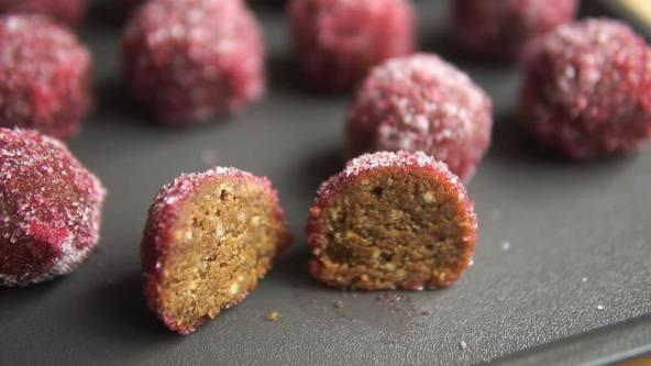Keks i orahe ili lešnike stavite u blender i dobro izblendirajte. Zatim sipajte u posudu, pa dodajte vanilin šećer, istopljen puter i med. Pomešajte kafu sa 3-4 kašike vrele vodi i dobro promešajte. Sipajte kafu u smesu za sitne kolače i lepo sjedinite sve. Oblikujte loptice i ređajte na pleh obložen pek papirom. Svežu cveklu izrendajte, pa procedite kroz sito. Uvaljajte sitne kolače u sok od cvekle, pa u šećer.