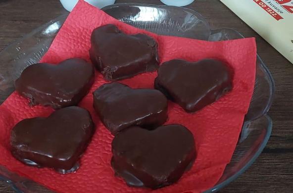 Kada se kolač ohladi, modlama u obliku srca isecite kolače. Uvaljajte ih u čokoladu koju ste istopili sa puterom. Poređajte na tacnu, pa stavite u frižider da se stegne.