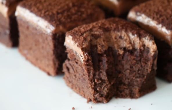 Penasto umutite žumanca sa kašikom šećera, pa u tu smesu sipajte mleko, vodu i vanilu. Sve lepo sjedinite, pa u smesu dodajte čokoladu koju ste otopili sa puterom. Na kraju dodajte prosejano brašno sa praškom za pecivo i kakaom, pa špatulom lagano promešajte. Belanca umutite, pa dodajte preostali šećer (70 g) i mutite dok ne dobijete čvrst šne. Dodajte u smesu sa žumancima i lagano sjedinite.