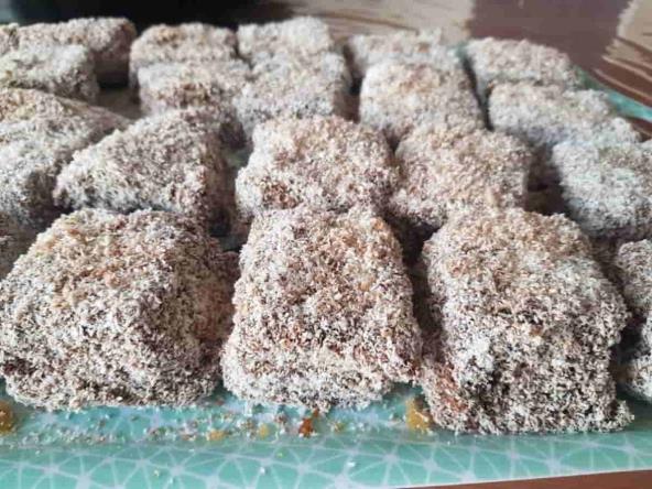Biskvit isecite na kocke i umočite u glazuru, pa u kokos. Ostavite da se ohlade.