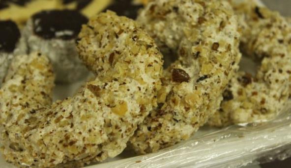 3. Veliku tespiju prethodno pripremite, stavite na nju papir za pečenje. Testo podelite na otprilike 50 komada-kuglica. Svaku kuglicu dlanovima formirati u valjak (5 cm), uvaljati u seckane orahe i blago krajeve saviti ka unutrašnjosti da se dobije oblik orasnice kao na slici.