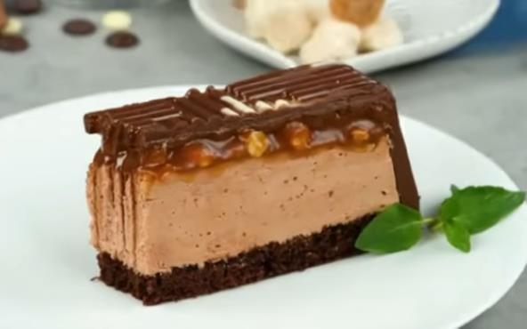 Istopite belu i mlečnu čokoladu, pa ih sipajte u dve kese za zamrzivač i isecite vrh. Uzmite neku plastičnu posudu i sipajte na sve četiri strane istopljenu belu čokoladu, ali sipajte na sredini svake strane. Preko sipajte istopljenu mlečnu čokoladu. Pomerajte plastičnu činiju tako da mlečna čokolada pokrije celu posudu, pa stavite u zamrzivač. U tiganju istopite šećer (200 g), pa dodajte puter. Kuvajte dok se i puter ne istopi, pa sipajte u neku posudu. Pokrijte providnom folijom i ostavite da se ohladi 20 minuta. Zatim u tu smesu dodajte pečeni kikiriki i promešajte. Pomešajte želatin sa vodom i ostavite da nabubri. Zatim da dodajte u nutelu i promešajte. Nutelu sa želatinom dodajte u slatku pavlaku (200 ml) koju ste umutili sa šećerom u prahu. Sve lepo sjedinite. Jaja umutite sa šećerom (50 g), a zatim sipajte ulje i nastavite da mutite. Dodajte prosejano brašno, kakao i prašak za pecivo, pa sve lagano sjedinite. Sipajte u tepsiju koju ste obložili pek papirom, pa pecite u rerni na 180°C oko 20 minuta. Isecite koru tako da bude iste veličine kao plastična posuda u kojoj je čokolada. Izvadite zaleđenu čokoladu iz posude, pa prvo sipajte smesu sa kikirikijem. Zatim sipajte fil i na kraju stavite koru. Okrenite kolač tako da je kora na donjoj strani i ohladite u frižideru sat vremena. Služite!